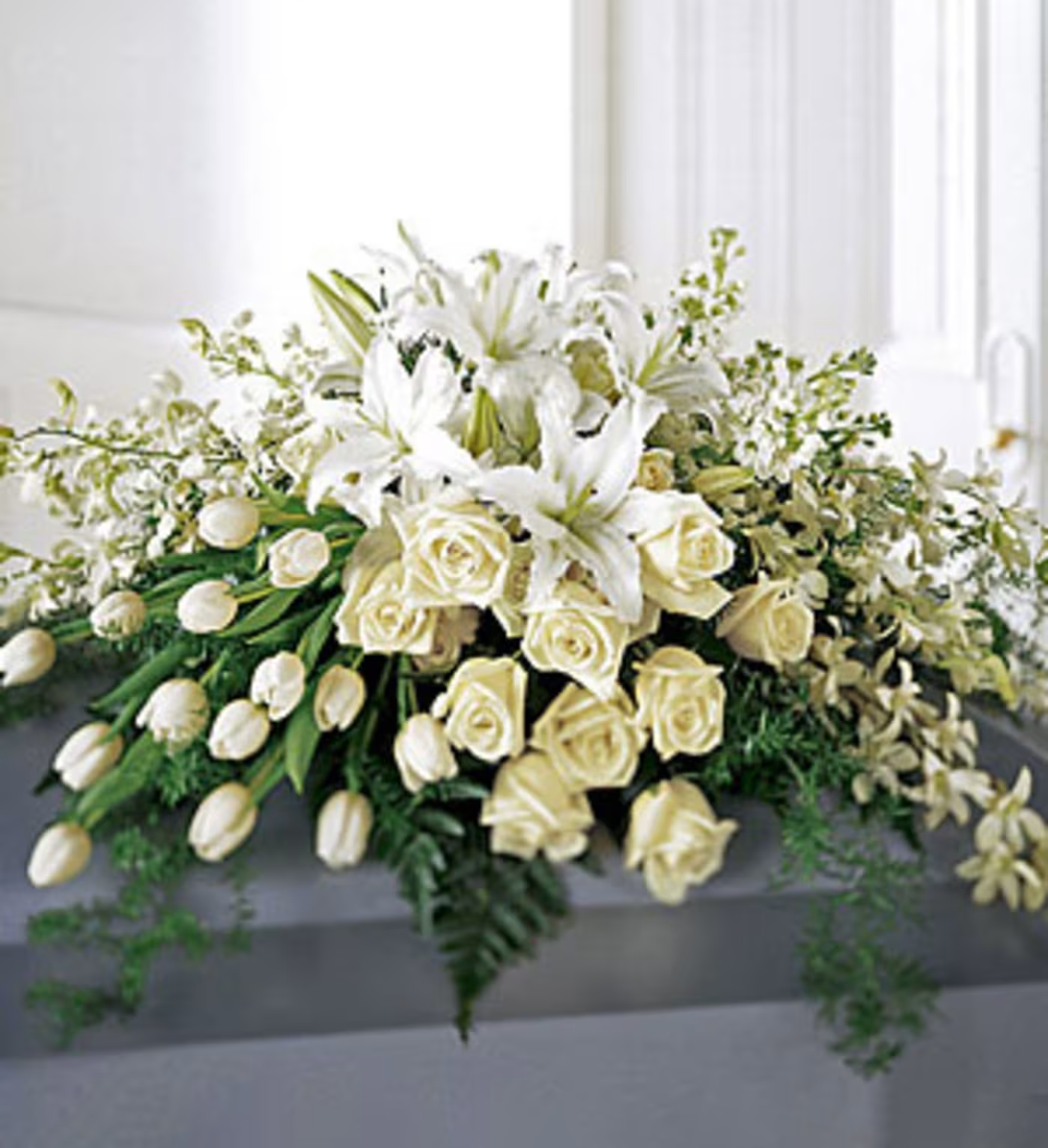 All white casket blanket arrangement. Can be designed for half or full length