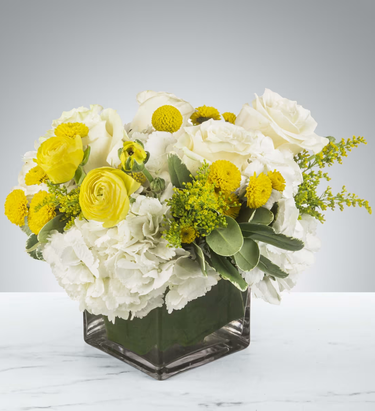 Brighten any day with this cheerful arrangement of sunny yellow blooms paired with crisp white roses and lush hydrangeas. Presented in a modern glass cube vase, this fresh and vibrant design is perfect for Mother’s Day appreciation, Valentine’s Day surprises, or any celebration of joy and affection. A premium floral gift that radiates happiness and love.
