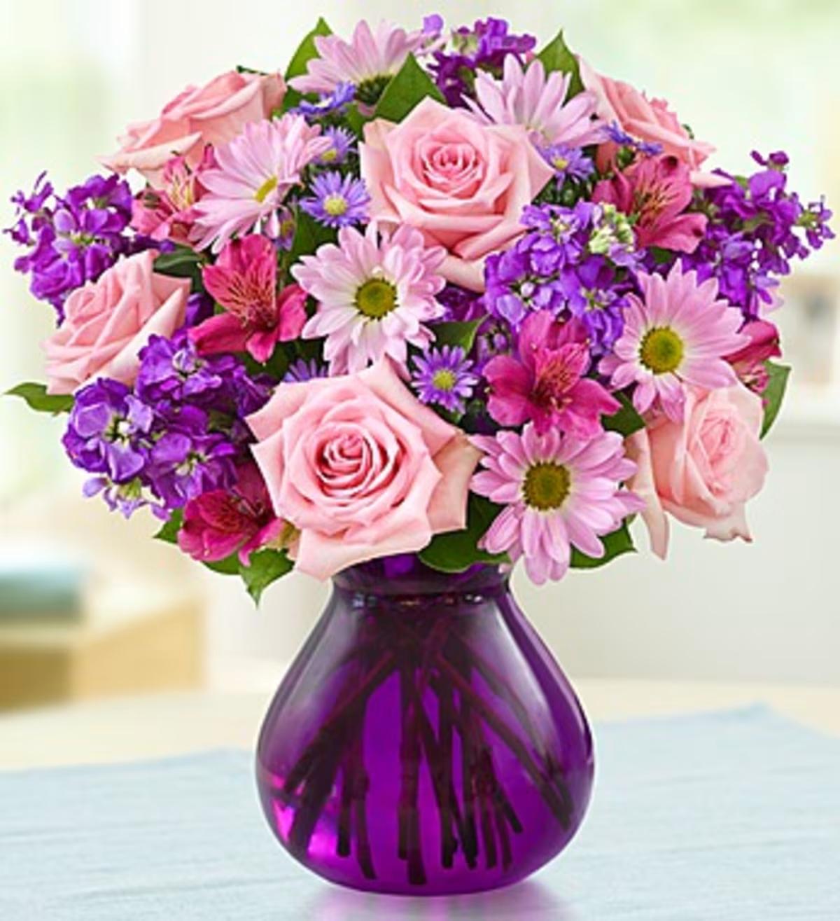 Send her this truly original bouquet of lovely roses, daisy poms, stock, alstroemeria and monte casino in shades of pink and purple. Delivered in a stylish purple glass vase to bring out the richness of color — and help you express yourself perfectly. Hand-crafted arrangement of roses, daisy poms, alstroemeria, stock, monte casino and salal created in honor of Womenâs Week Artistically designed by our expert florists in a chic purple glass vase; measures 7″H Large arrangement measures approximately 15.5″H x 11″D Medium arrangement measures approximately 15″H x 10.5″D Small arrangement does not include roses and measures approximately 14″H x 10″D Our florists hand-design each arrangement, so colors, varieties, and container may vary due to local availability