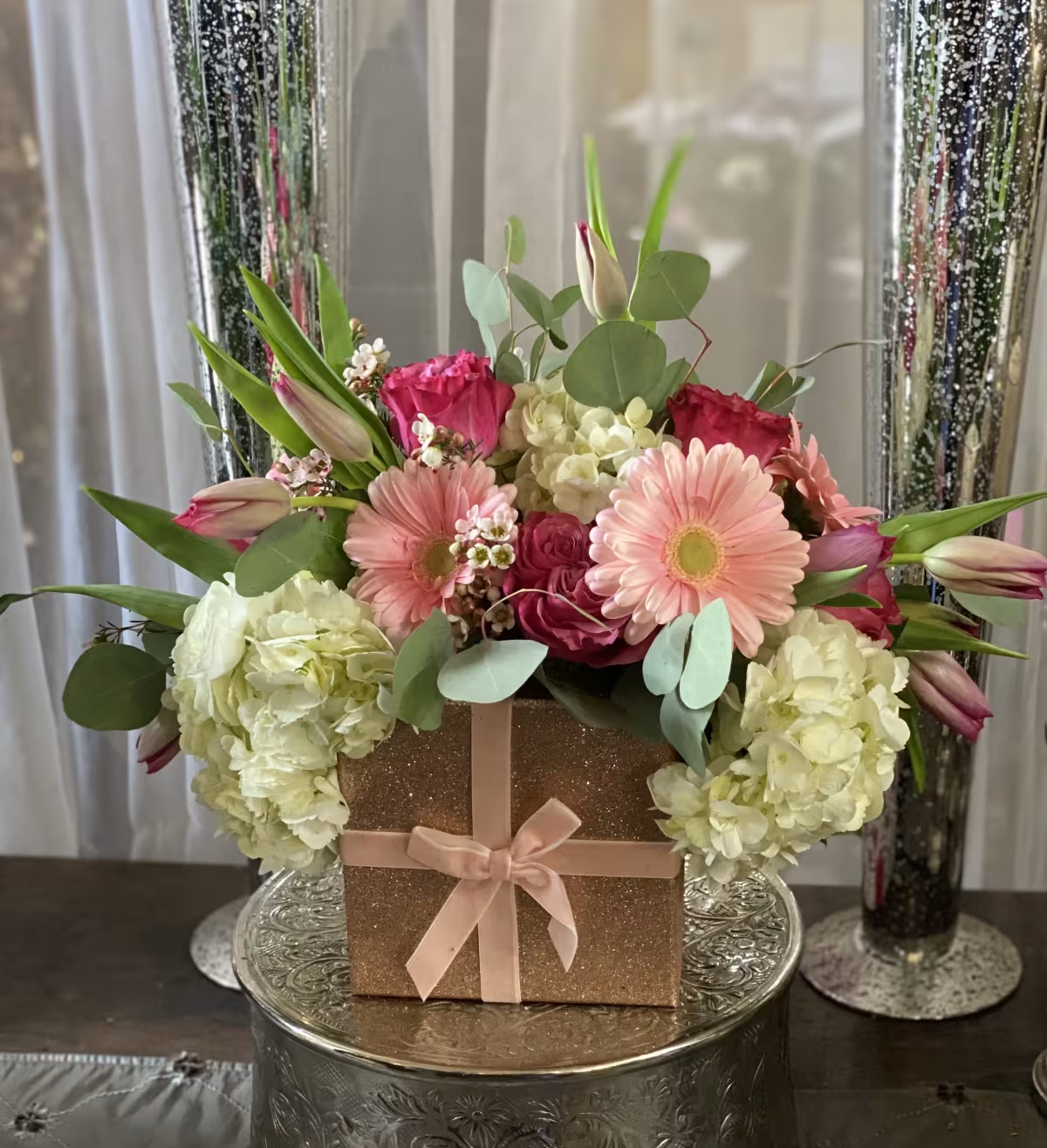 A beautiful modern arrangement in a sparkle present box.