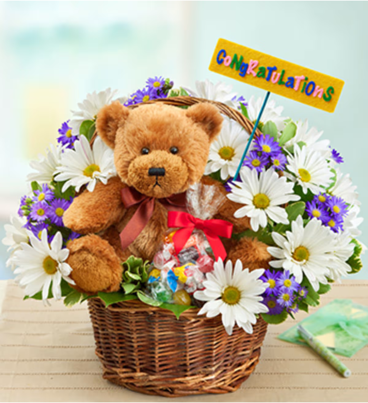 EXCLUSIVE Congratulate the graduate in a big way! This Lotsa Love® gift is fun and heartfelt, and has all the makings of a celebration. Our florists will deliver your best wishes with a hand-designed basket arrangement of bright blooms, an exclusive plush bear, a bag of tasty candies and, of course, a âCongrats!â balloon. Bright and beautiful arrangement of white poms, lavender monte casino, salal and variegated pittosporum Expertly designed by our florists in a handled willow basket and accented with a felt “Congratulations!” pick; basket measures 8″H Arrives with an 18″D Mylar “Congrats!” balloon; design on balloon will vary due to local availability Our cuddly Lotsa Love® plush brown bear with brown satin bow; plush measures 10″H and is safe for ages 3 and up Also includes a bag of delicious assorted candy; assortment may vary Arrangement measures approximately 12″H x 12″L Our florists select the freshest flowers available so colors and varieties may vary