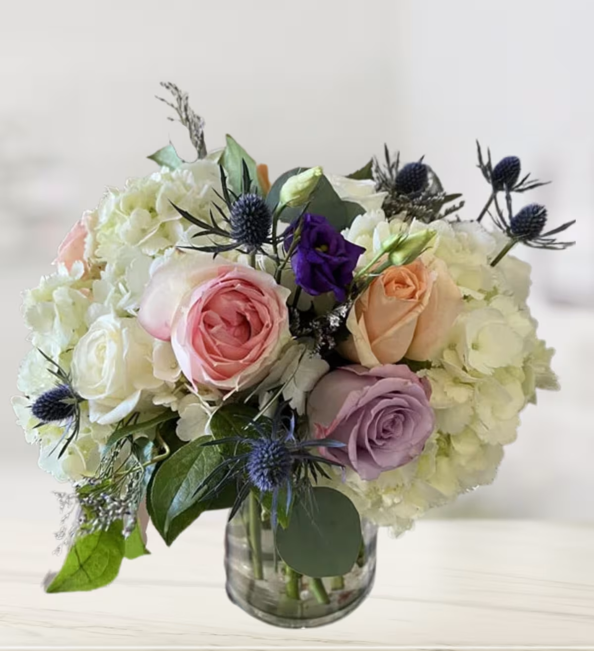 Roses, hydrangea, thistle, and pokes of spray roses, make this the perfect pick me up. Components may vary. Substitutions may be made. Specific vase subject to availability. Shown in Deluxe.