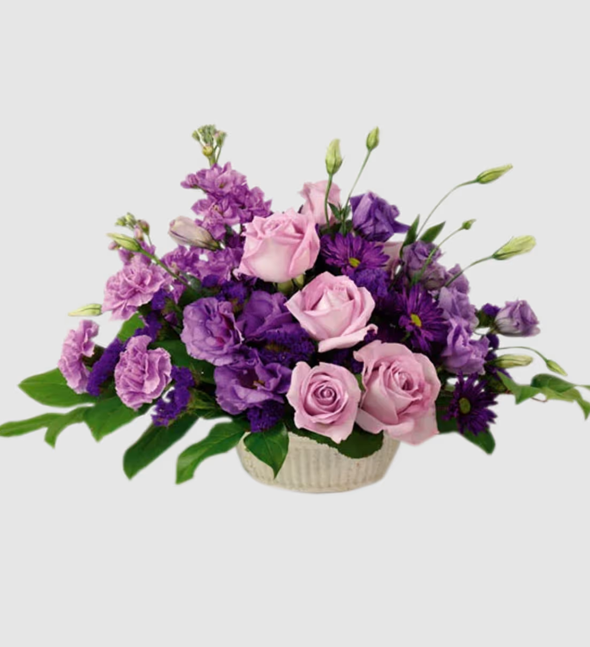 Regal purple draws “oohs” and “aahs” in this lovely centerpiece of roses, lisianthus, carnations and more!