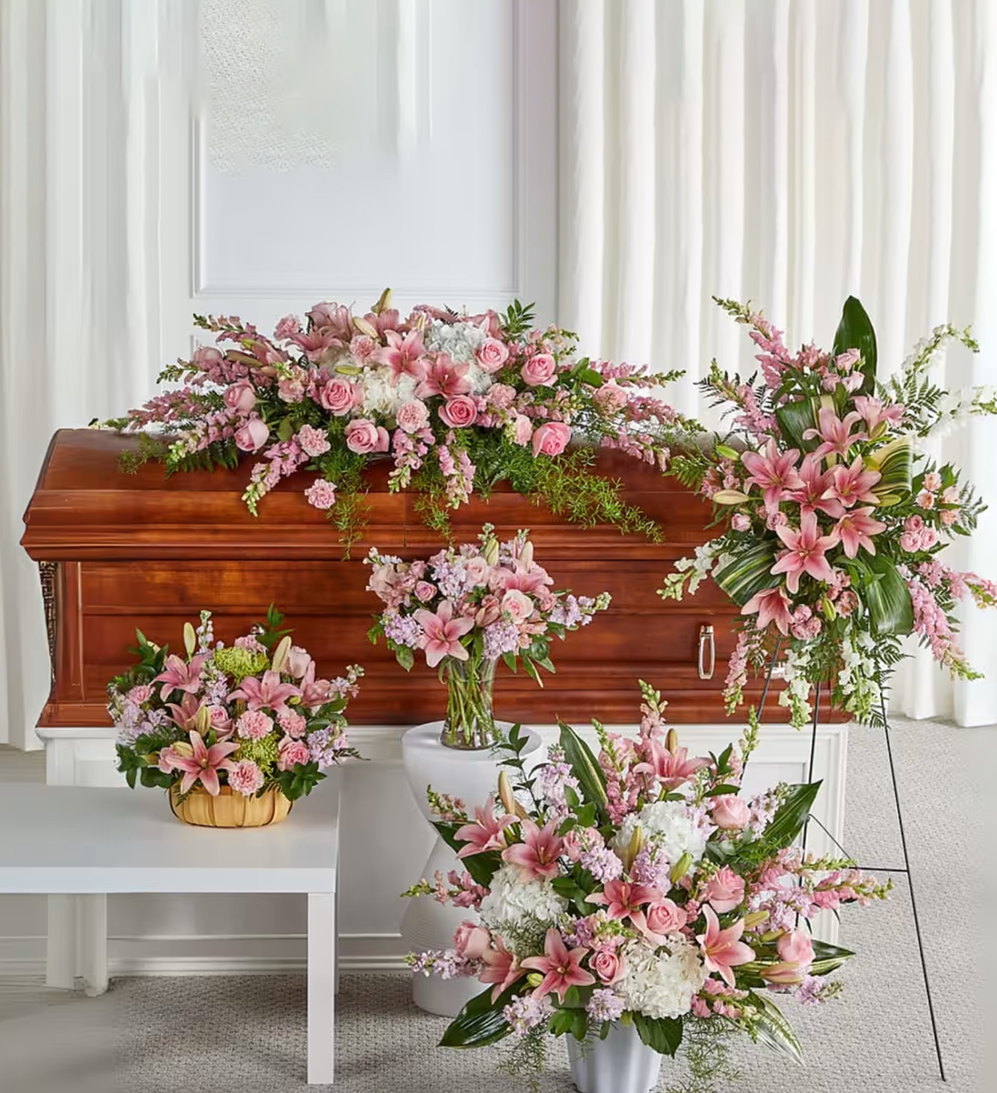 We understand how difficult this time can be. That’s why we’ve created this five-piece floral set—to help ease your stress while honoring your loved one with beauty and care.